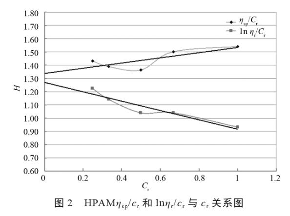 特性黏度[η]是聚合物溶液的特性黏數(shù),和濃度無關(guān),由此可知,以Cr為橫坐標,ηsp/Cr和lnηr/Cr為縱坐標作圖。通過兩組點各作直線,外推至Cr=0,求得截距H,若兩條直線不能在縱軸上交于一點,取兩截距的平均值為H。