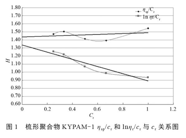 測得KYPAM-1、HPAM和MICROG三種聚合物的實驗數(shù)據(jù)(見表3-5)。水溶液法合成聚合物黏度一般較大,分子量較高,所以采用稀釋法計算其特性黏度;而對于反相乳液合成MICROG,其黏度較小,分子量估計只在200-500萬左右,稀釋后測量的變化不大,因此采用一點法計算。根據(jù)表3-4繪制對應的ηsp/Cr和lnηr/Cr與Cr關(guān)系圖(見圖1-2),求得截距H,從而計算特性黏度和分子量。