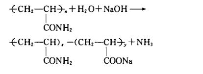 PAM在80-100℃堿性條件下,可以通過它的酰胺基水解而轉(zhuǎn)化為含有羧基的聚合物,這種聚合物和丙烯酰胺-丙烯酸鈉共聚物的結(jié)構(gòu)相似。反應(yīng)式如下: