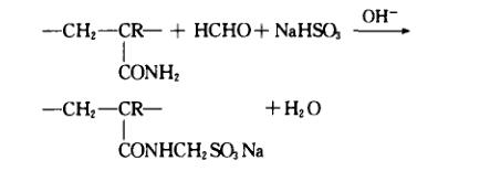 PAM與亞硫酸氫鈉和甲醛在堿性條件下反應(yīng),可在酰胺基上引入磺甲基生成陰離子衍生物—磺甲基化PAM。反應(yīng)式如下: