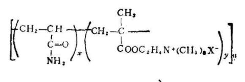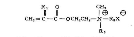 主要是丙烯酰胺與乙烯類的陽離子單體共聚,較常見的陽離子單體是季銨化的胺基酯或烷胺基酰胺。雖然母體叔胺基烷基酯和叔胺基烷基酰胺也在專利文獻(xiàn)上出現(xiàn),但經(jīng)常是與季銨化單體相聯(lián)系的。另一方面,雖有丙烯酰胺與未季銨化的叔胺基烷基酯的共聚物作為商品陽離子絮凝劑,但它們的使用卻不廣泛。較常見的季銨化單體的通式可用下式表示: